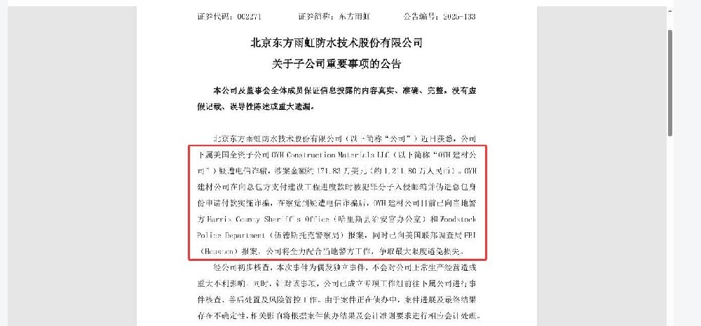 12月23日晚,A股上市公司东方雨虹(002271)公告,该公司下属美国全资子公司OYH建材公司近日疑遭电信诈骗,涉案金额约171.83万美元(约1211.80万元人民币)。目前,该公司已向美国联邦调查局FBI(Houston)报案,案件正在侦办中。